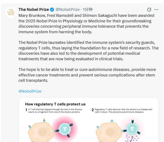 10月6日,2025年诺贝尔生理学或医学奖授予了在免疫耐受领域做出奠基性贡献的科学家。