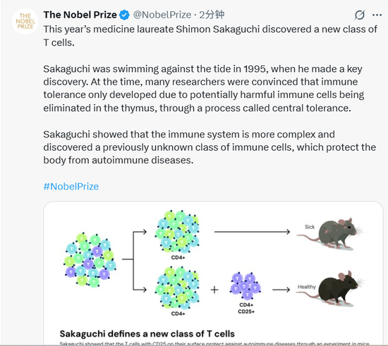 今年的医学奖得主坂口志文发现了一类新的T细胞。