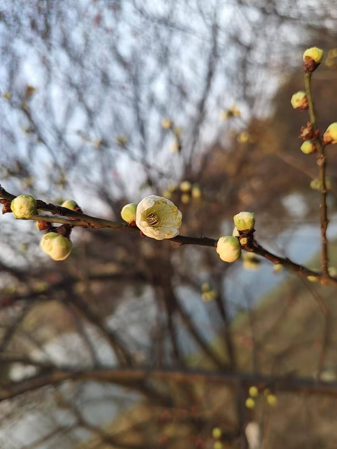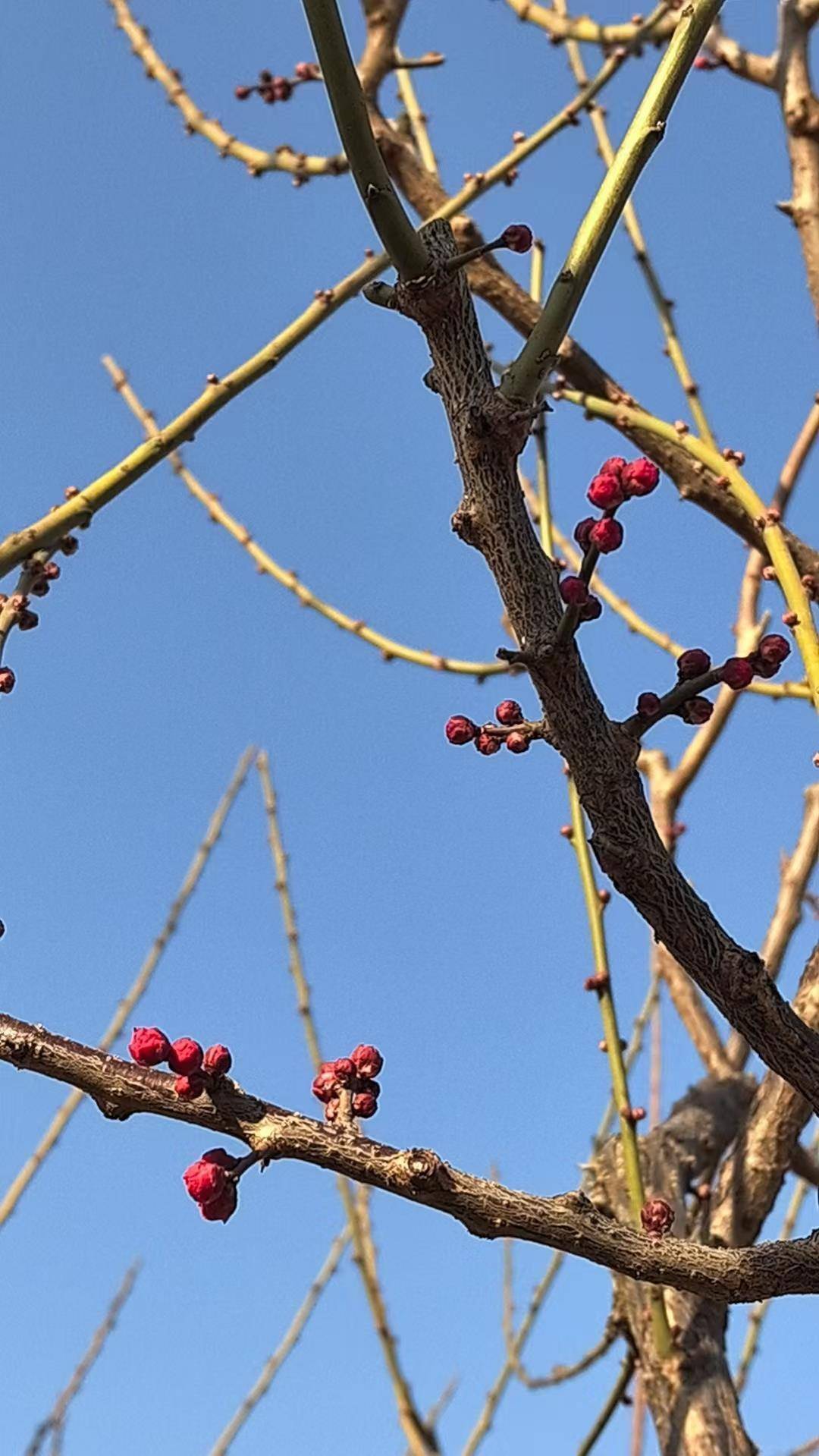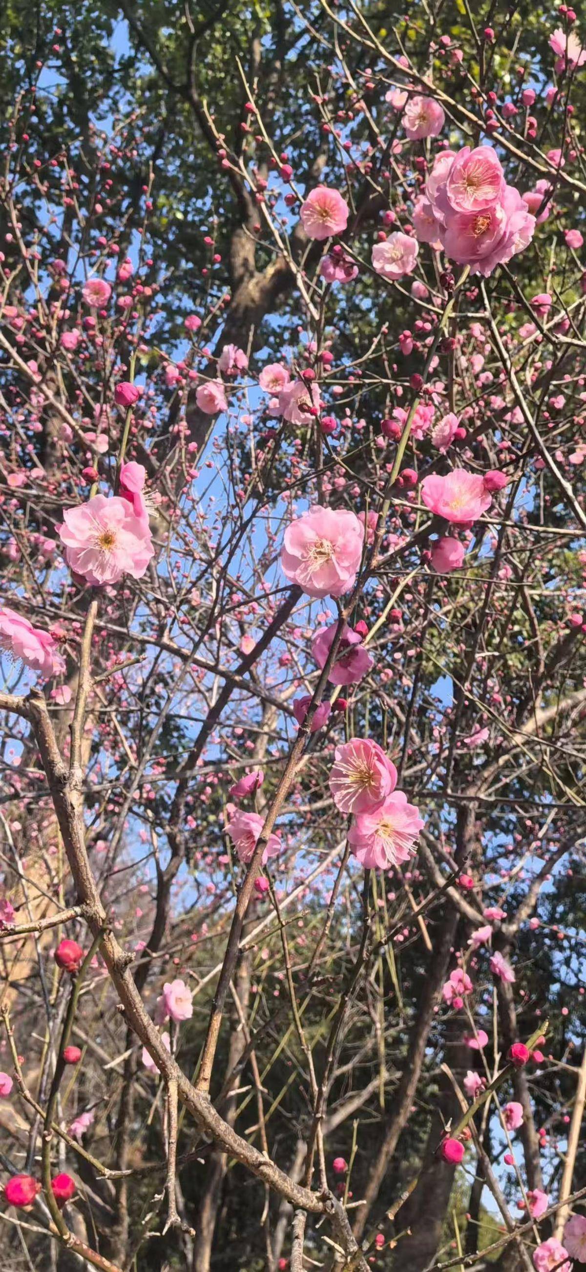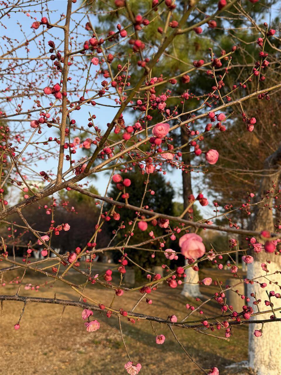 在中山公园独有一株梅花树绽放,红梅、美人梅仍呈现的是骨感美,花苞都还没冒出。